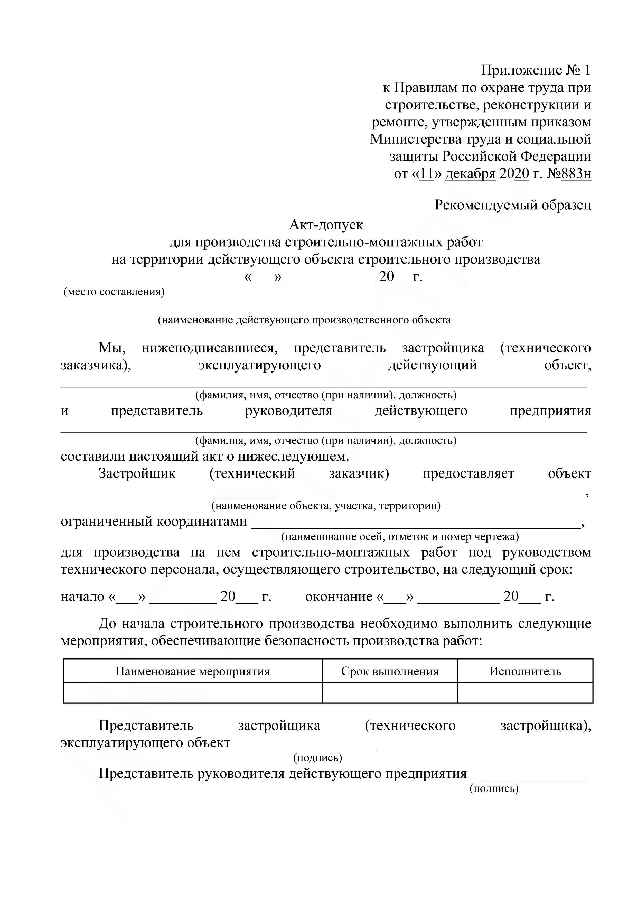- Приложение №1. Акт-допуск для производства строительно-монтажных работ на территории действующего объекта строительного производства