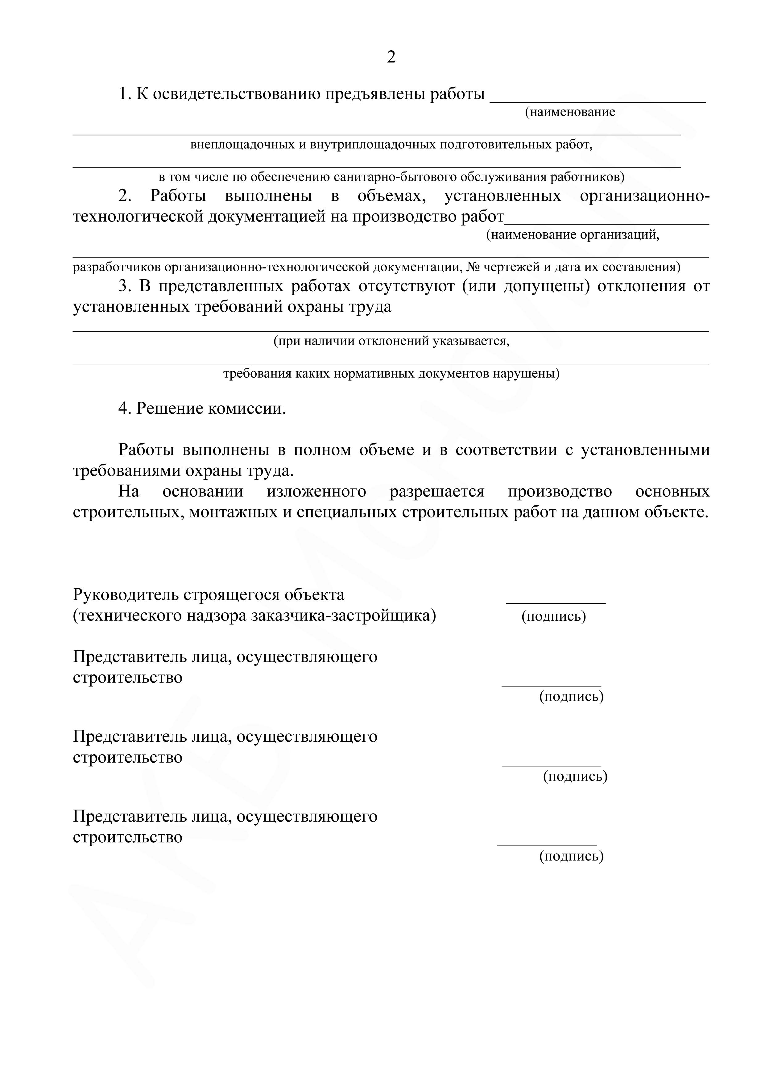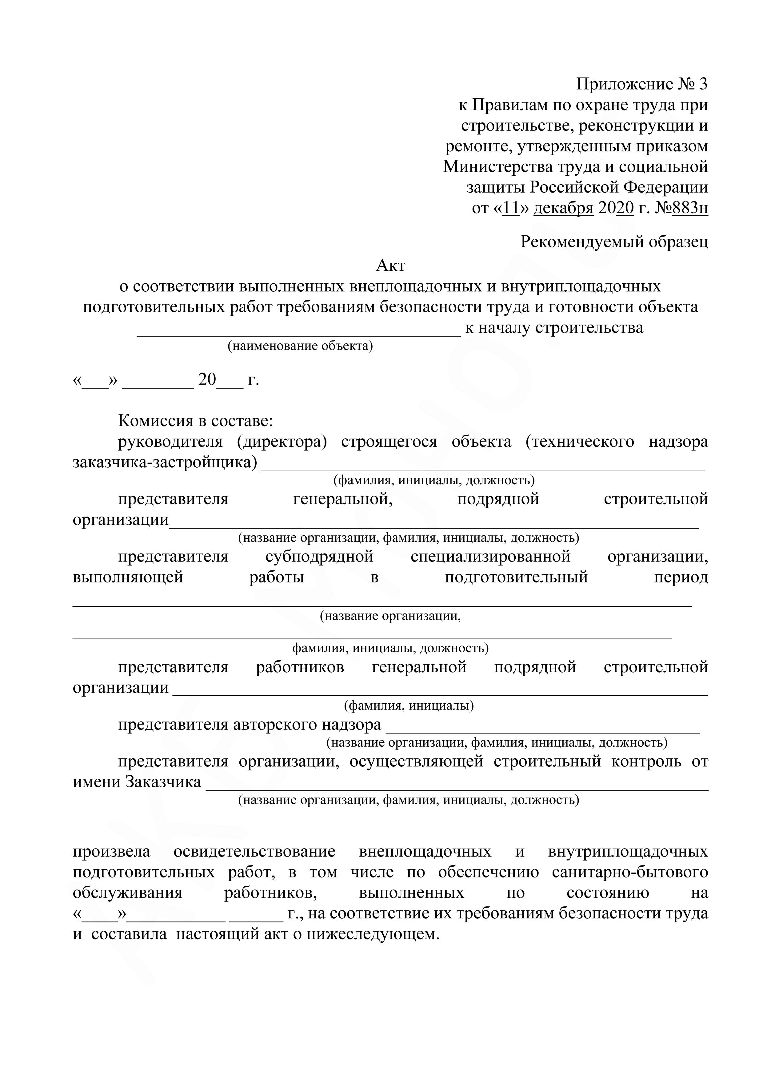 - Приложение №3. Акт о соответствии выполненных внеплощадочных и внутриплощадочных подготовительных работ требованиям безопасности труда и готовности объекта к началу строительства