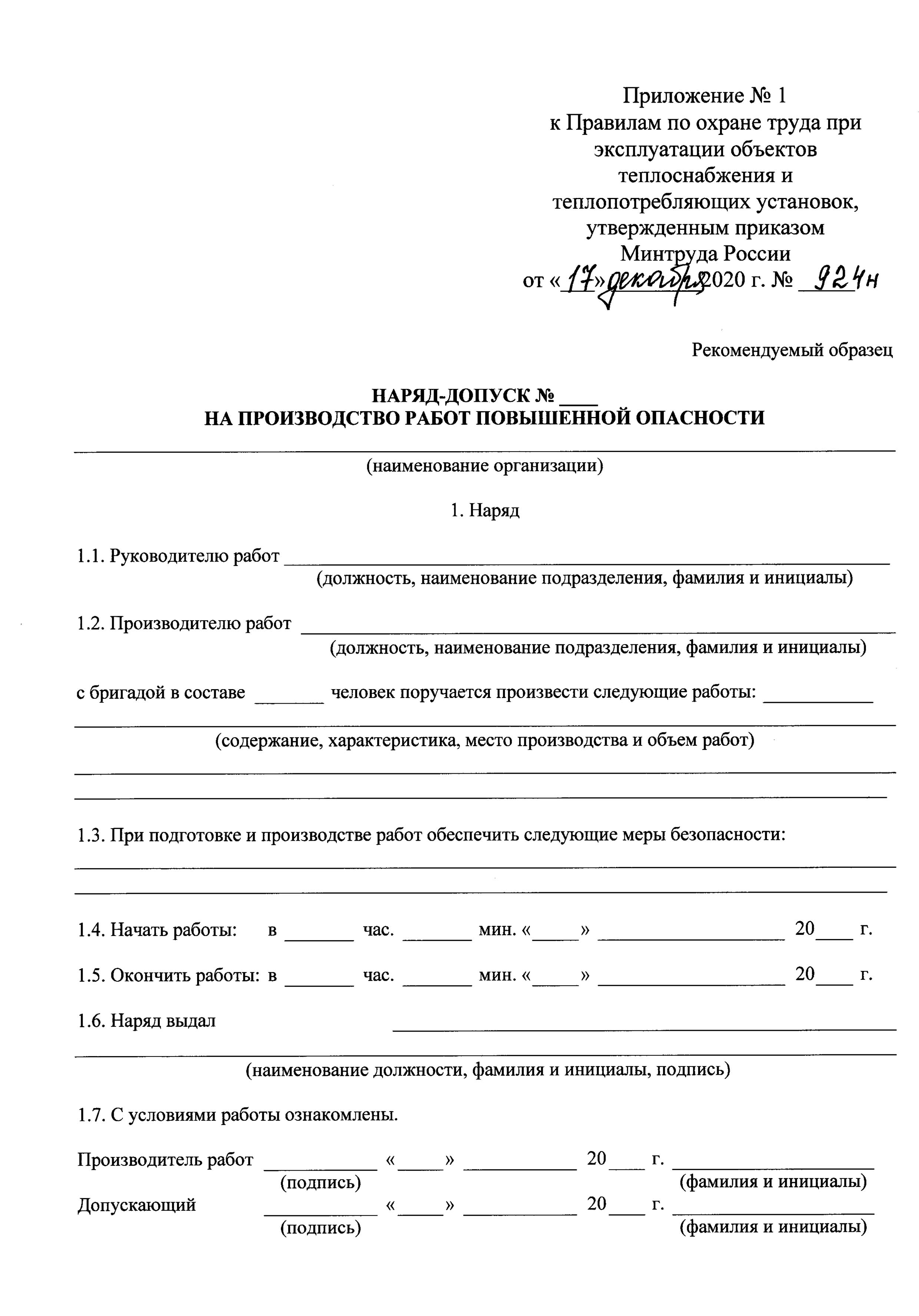 - Приложение 1. Наряд-допуск на производство работ повышенной опасности