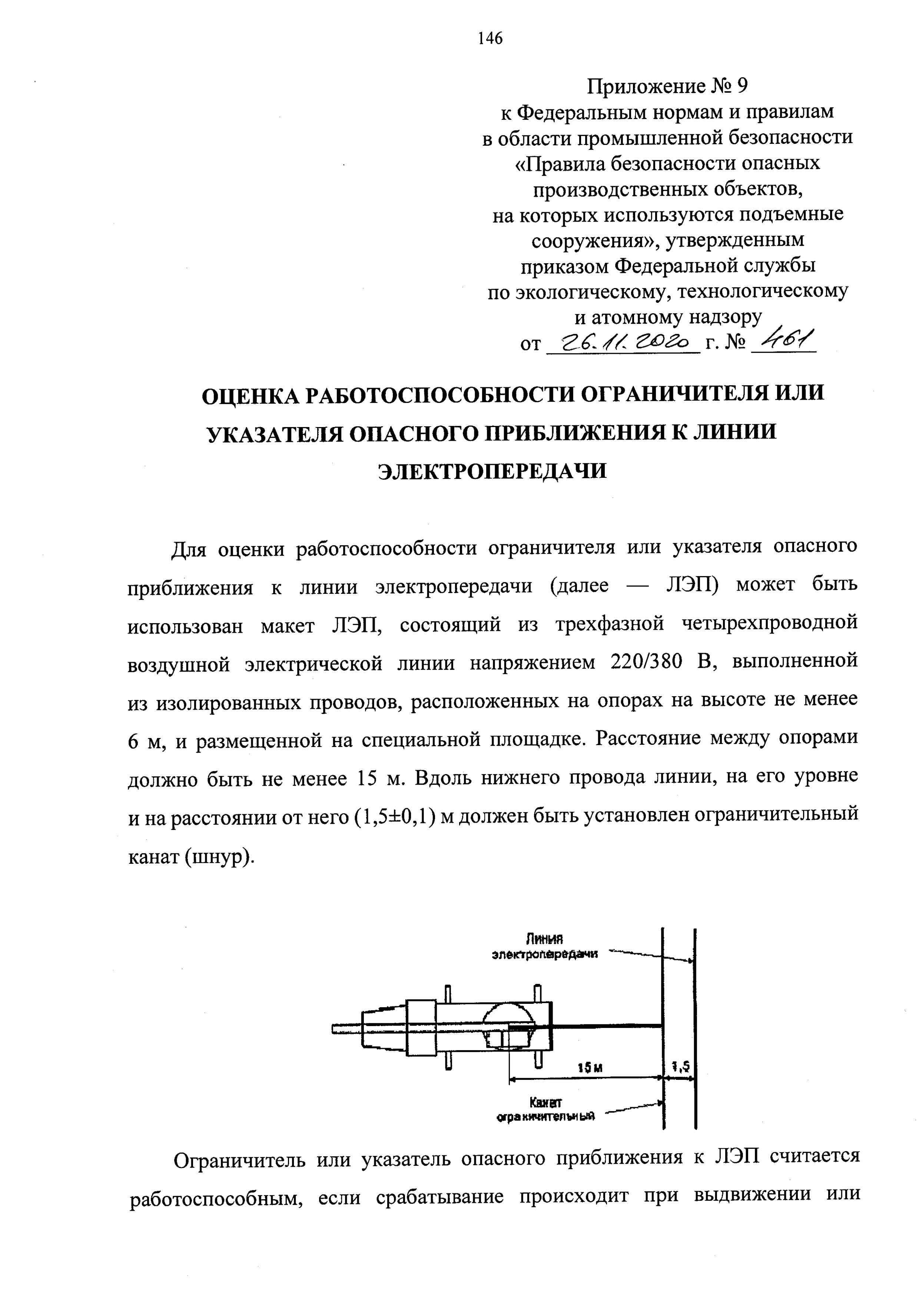 266. Оценка работоспособности ограничителя или указателя опасного приближения к линии электропередачи производится в соответствии с приложением №9 к настоящим ФНП.