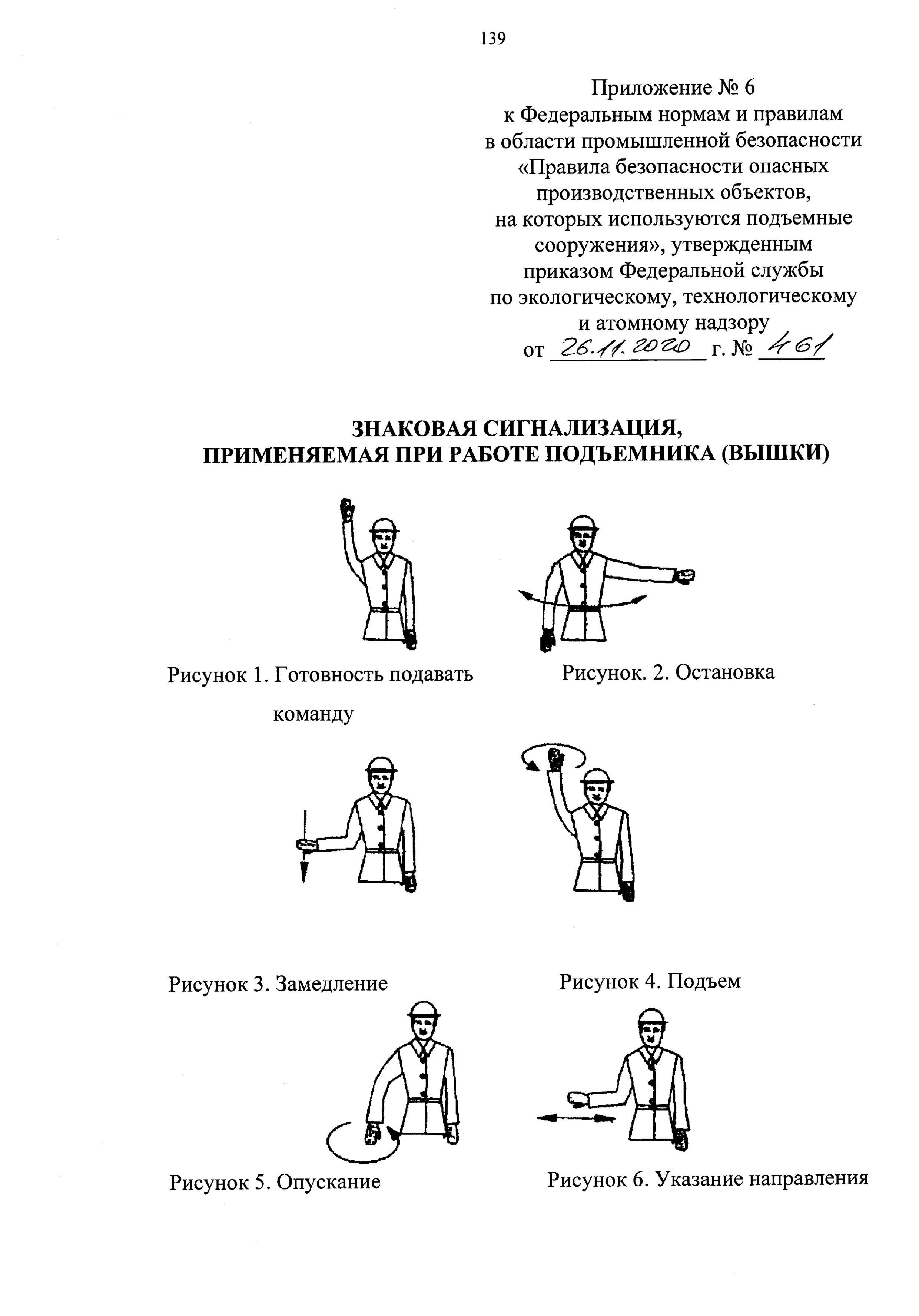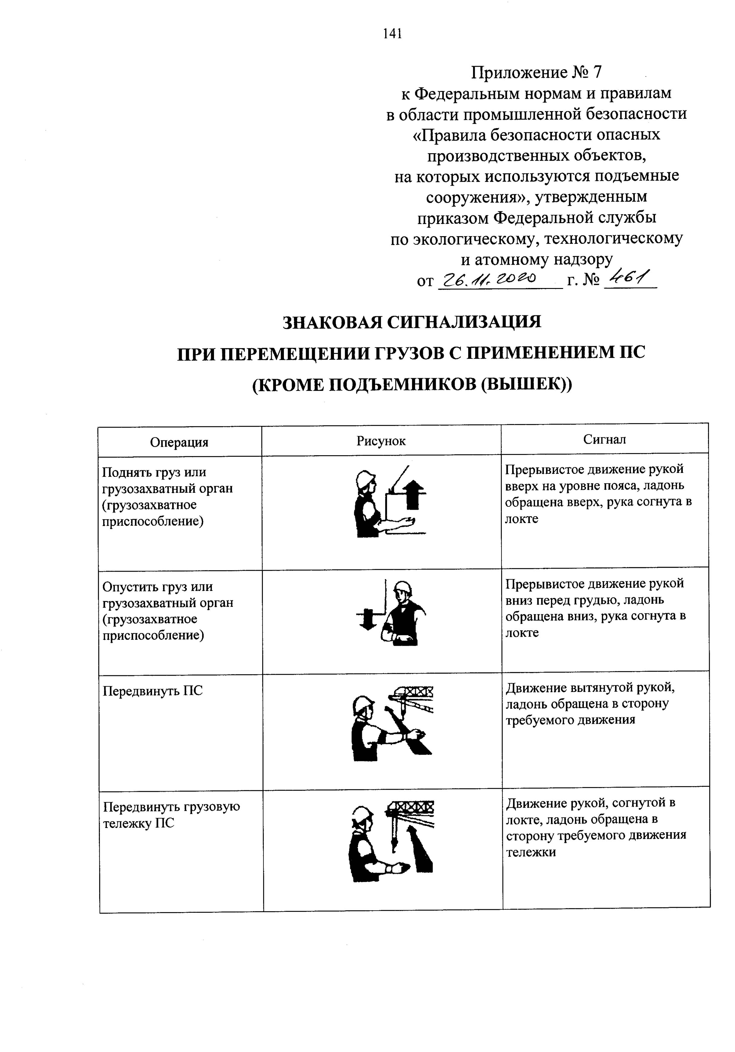 248. Эксплуатирующая организация должна установить порядок обмена сигналами между стропальщиками и крановщиками. Знаковая сигнализация и система обмена сигналами при радиопереговорной связи должны быть внесены в производственные инструкции для крановщиков и стропальщиков. Знаковая сигнализация для крановщиков и стропальщиков приведена в приложении №7 к настоящим ФНП.
